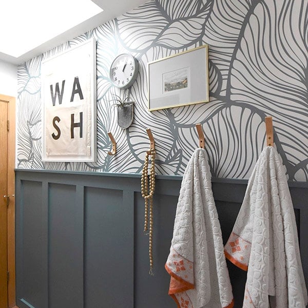 The oversized leaves in this bathroom add whimsical fun and the board & batten breaks up the print.