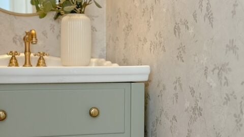 While traditional is not my style, this is a very successful small print paired with a light green vanity cabinet.
